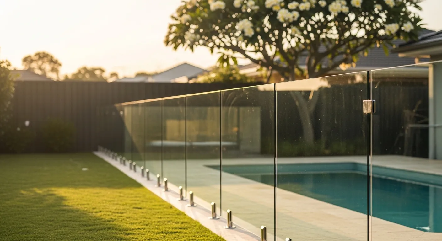 ✅ Glass pool fencing (legal compliance), sloped terrain, retaining walls needed, aluminum slat, council approval required, dividing fence disputes